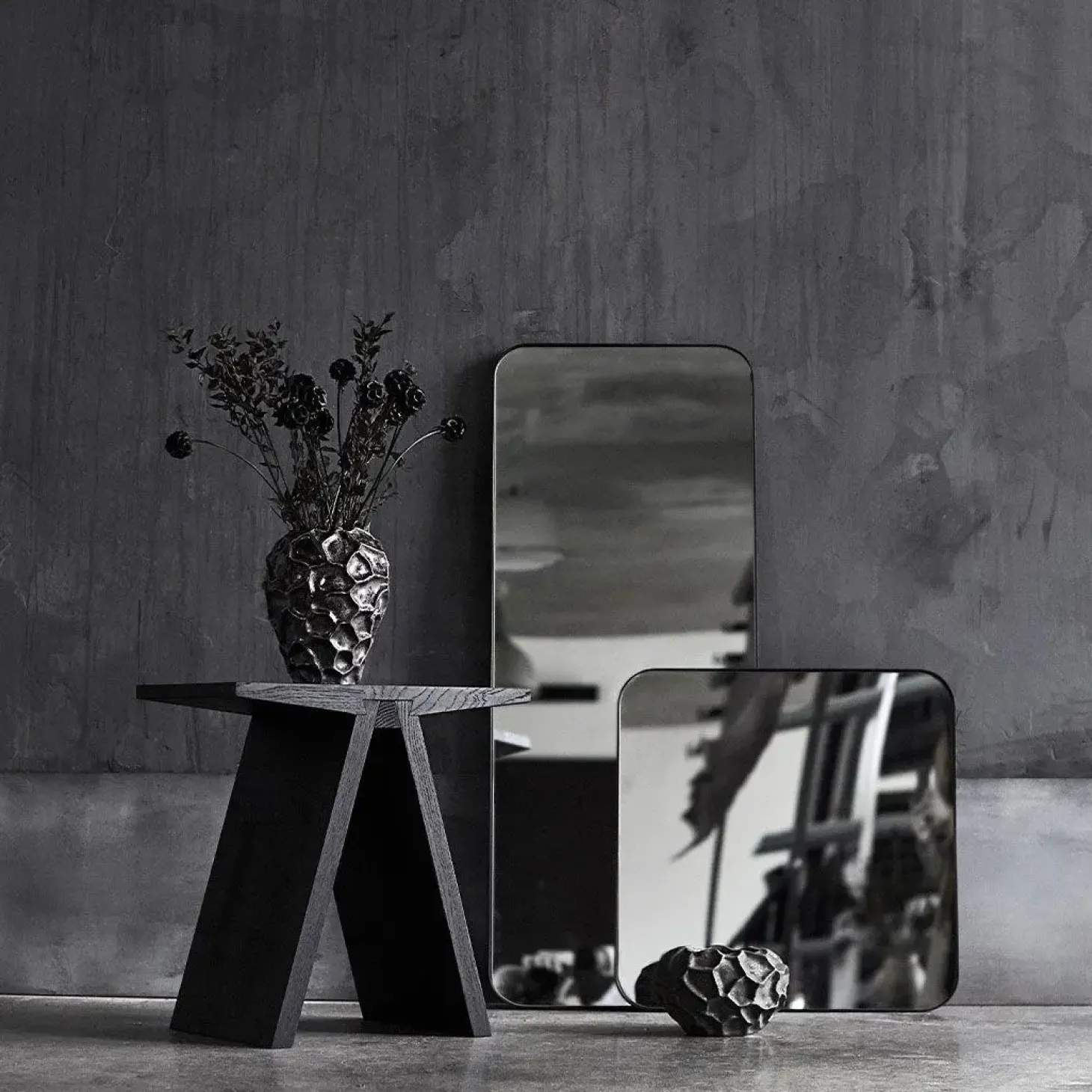 Ever Vægspejlet kendetegnes ved sin enkle udformning. Den slanke, sorte metalramme omslutter spejlet med præcision og giver det et moderne udtryk. De afrundede hjørner tilføjer en blød kontrast til de rene linjer, hvilket resulterer i et harmonisk helhedsindtryk.