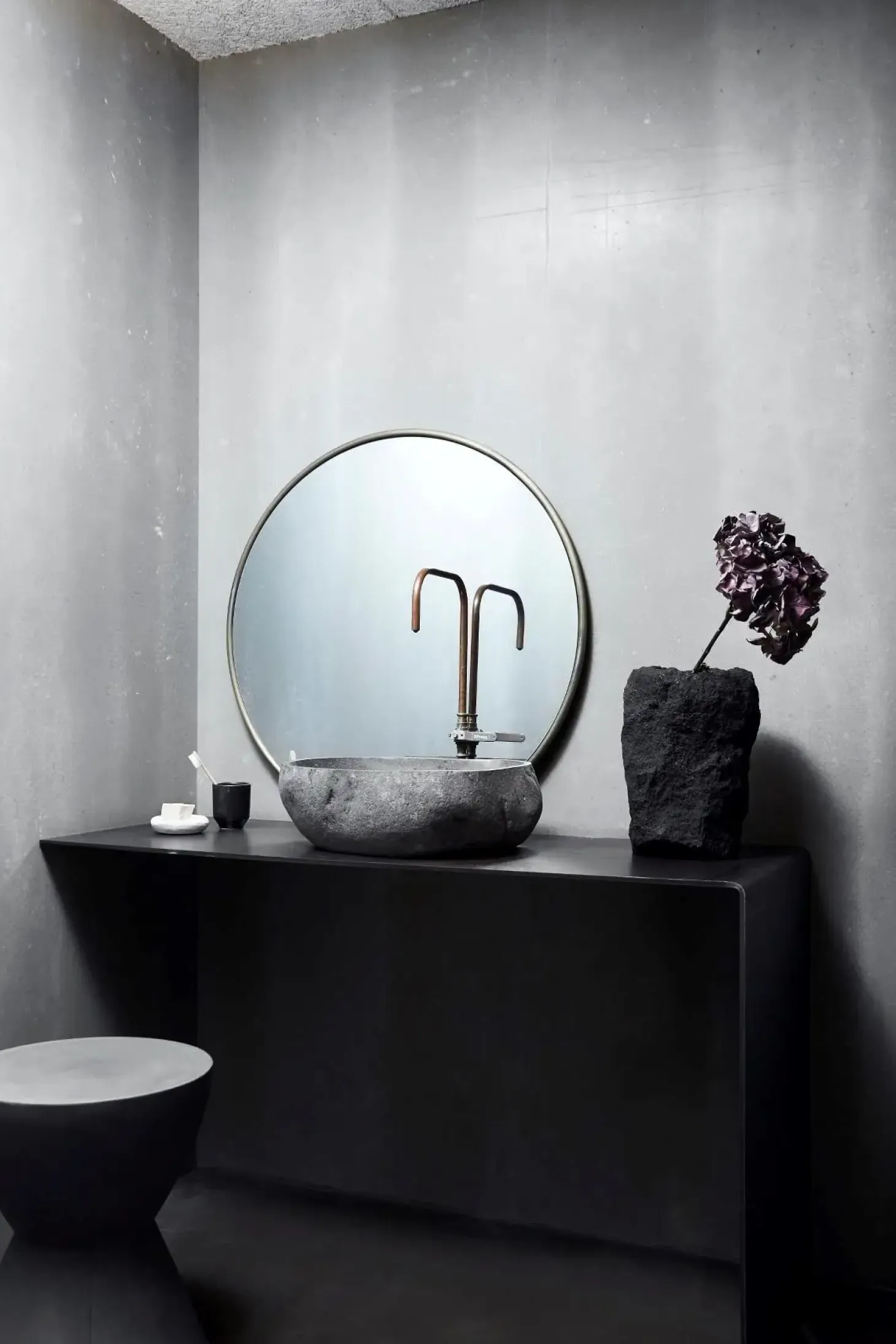 Muubs Valley Vask er fremstillet i natursten, hvor den glatte, blanke indvendige overflade kontrasterer med den rå, teksturerede yderside. Denne kombination af overflader giver vasken en distinkt karakter og gør hver enkelt vask særpræget i sit udtryk.