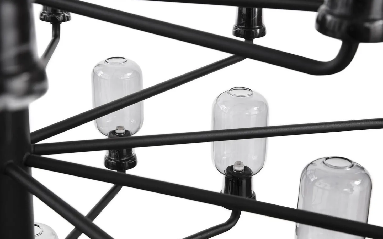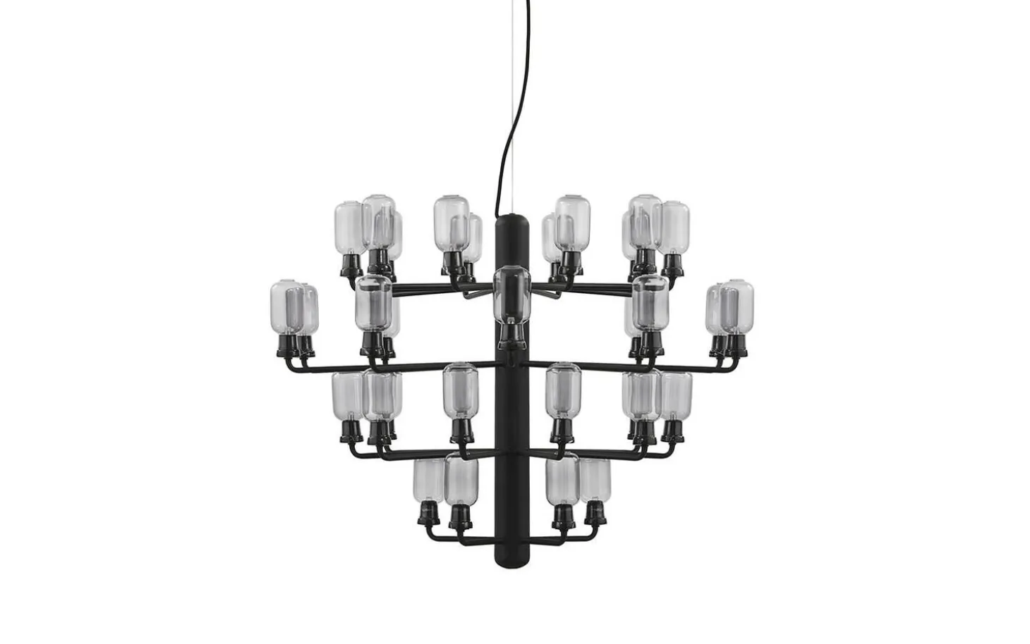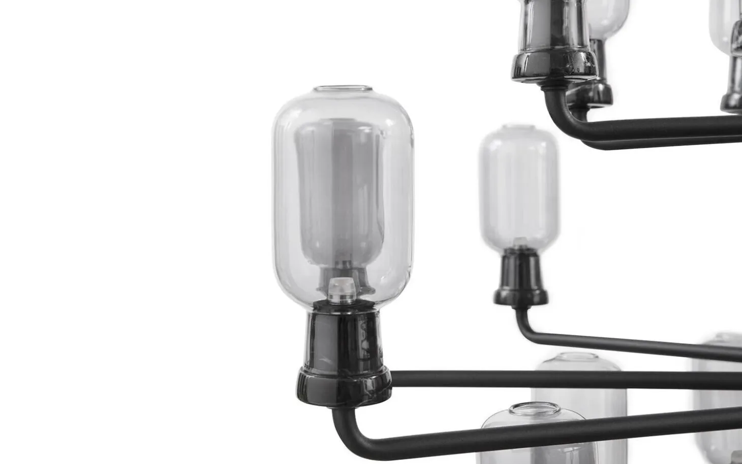 Amp er en serie af små lamper inspireret af gamle rørforstærkere fra 1960’erne. De unikke former og klassiske materialer af marmor og glas tilføjer en nostalgisk og samtidig moderne følelse til Amp. Den dekorative pære udsender et fantastisk skær gennem de guld/grønne og røg/sorte glaslampeskærme, mens uigennemsigtigheden af det hvide/hvide glas fremhæver lampens form, så den fremstår som en ren og spøgelsesagtig æstetisk silhuet. Lampekollektionen producerer et smukt og behageligt lys, og det sofistikerede design kan indgå i mange forskellige boligindretninger. Hæng en Amp-lampe i gangen, i et hjørne af stuen, eller skab en klynge af Amp-lamper over dit spisebord for en moderne balsaleffekt. Designet af Simon Legald