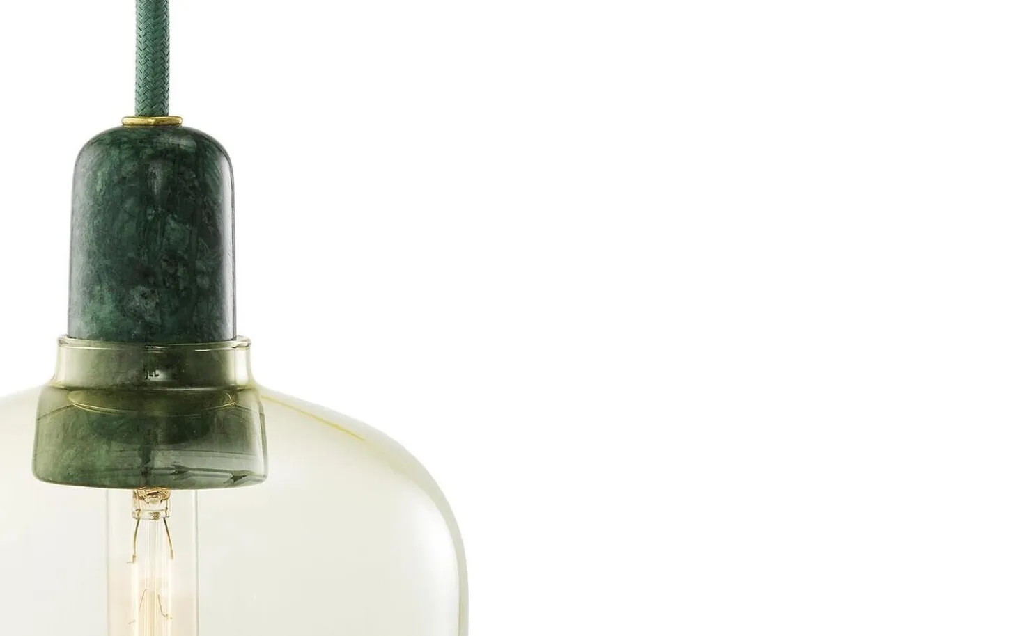Amp er en serie af små lamper inspireret af gamle rørforstærkere fra 1960’erne. De unikke former og klassiske materialer af marmor og glas tilføjer en nostalgisk og samtidig moderne følelse til Amp. Den dekorative pære udsender en fantastisk glød gennem de guld/grønne og røg/sorte glasskærme, mens uigennemsigtigheden af det hvide/hvide glas fremhæver lampens form, så den fremstår som en ren og spøgelsesagtig æstetisk silhuet. Lampekollektionen producerer et smukt og behageligt lys, og det sofistikerede design kan indgå i mange forskellige boligindretninger. Hæng en Amp-lampe i gangen, i et hjørne af stuen, eller skab en klynge af Amp-lamper over dit spisebord for en moderne balsaleffekt. Designet af Simon Legald