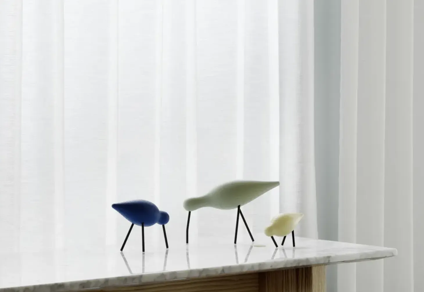 Lad din boligindretning tage flugten med Shorebirds – en række solide træfigurer med et stiliseret, men alligevel livligt udtryk. Den islandske designer Sigurjón Pálsson har skabt en række karakterfulde træfugle. Shorebirds enkle usminkede silhuet giver dem et næsten stiliseret udtryk. Samtidig er der lagt stor vægt på de små detaljer som variationer i kropstykkelser, halslængde og placering af ben og næb. Dette giver alle tre fugle deres egen unikke personlighed og tillader designet at blive levende. Den største af de tre fugle er inspireret af krøllen med dens lange hals og fornemme, nedadbøjede næb. Det er et aristokratisk væsen. Dens lange ben tager langsomme, velovervejede skridt, mens den kigger forsigtigt rundt. Den mellemstore fugl er vågen og aktiv som en rødbens. Denne elegante fugl er ofte at finde sammen med andre vadefugle. Endelig har vi sandpiperen; en selskabelig lille fugl, der ofte findes i store flokke. Arranger fuglene i en flok, kombiner forskellige farver eller inkluder en enkelt kystfugl i en lille setting, der består af andre personlige effekter. Den elegante Shorebird vil se rigtigt ud i næsten enhver indretning og er en fantastisk gave til hjemmet.