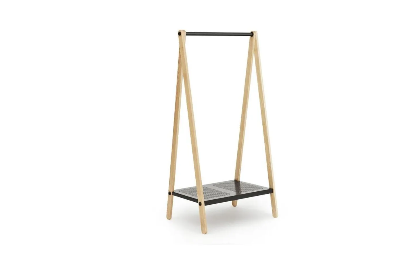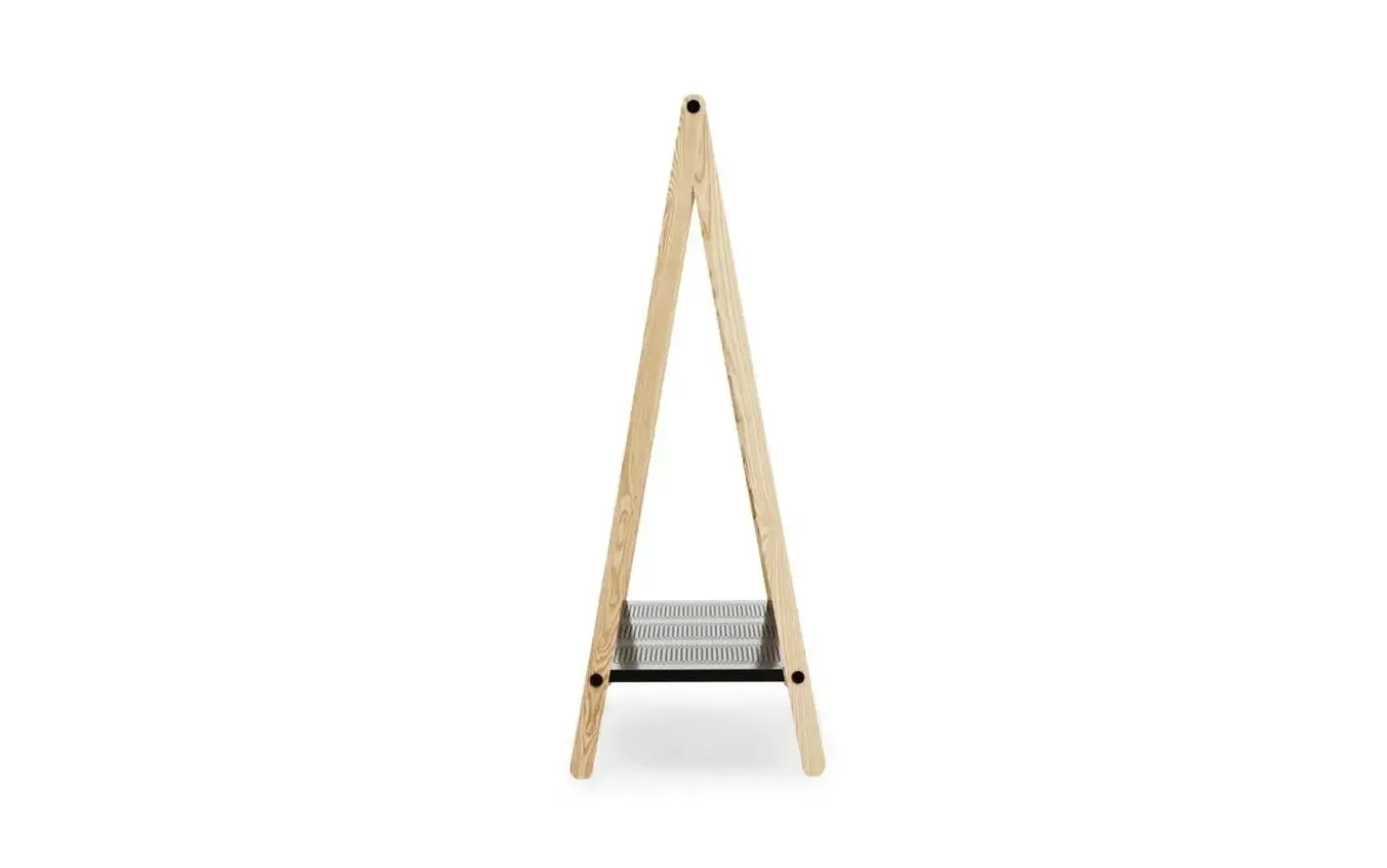 Toj er et tøjstativ med et industrielt og enkelt udtryk. Dens funktion er tydelig, og dens enkle konstruktion – med skinne, hylde og spær – giver plads til tøj, sko og tasker. Brug Toj i entreen, i stuen, kontoret eller soveværelset. Toj hjælper med at organisere dit tøj, sko og tasker på en stilfuld måde. Toj produceres i to forskellige størrelser, i asketræ med hvide eller grå hylder.