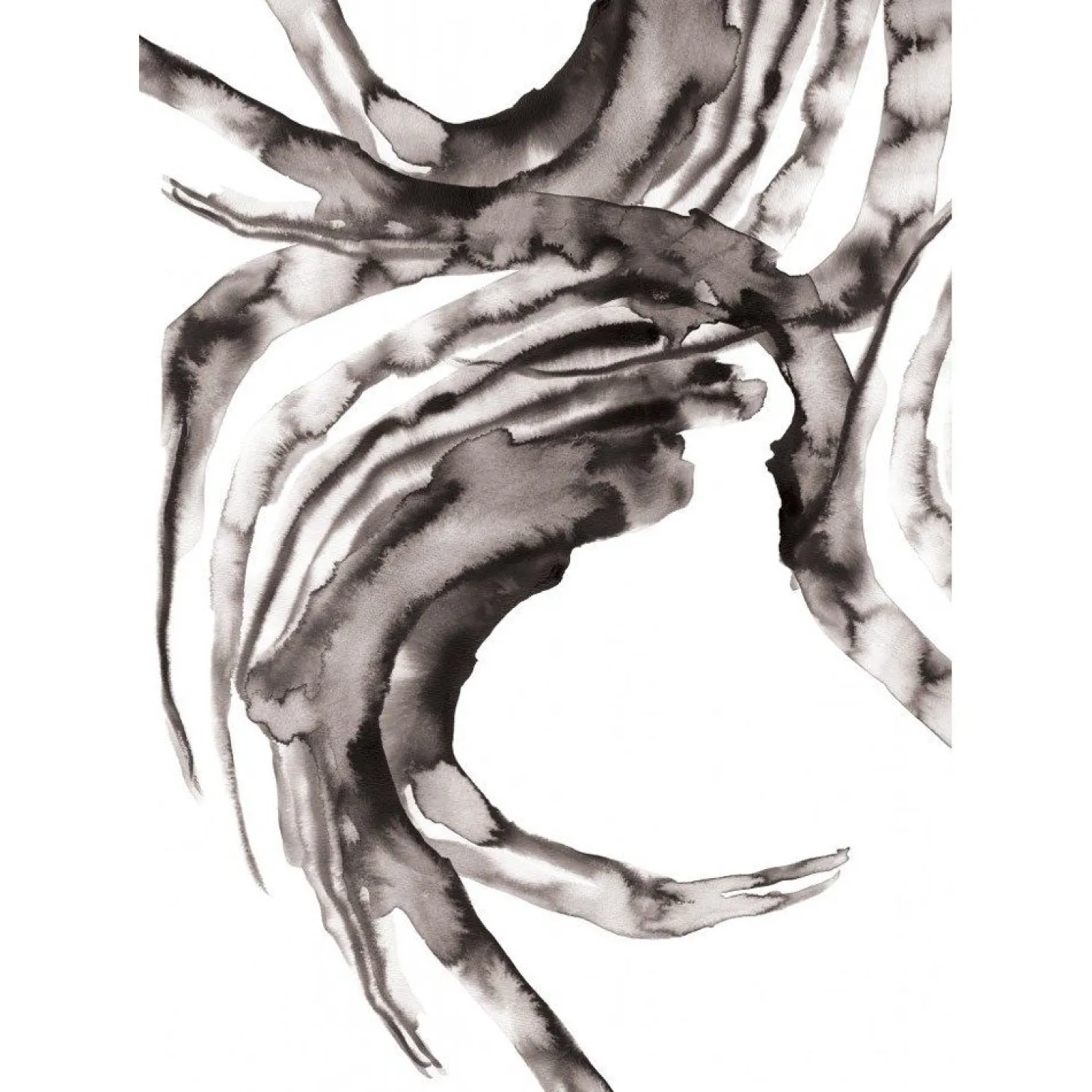 De lange penselstrøg og gennemsigtige former danner en monokrom helhed, som står i skarp kontrast til det underliggende hvide rum.