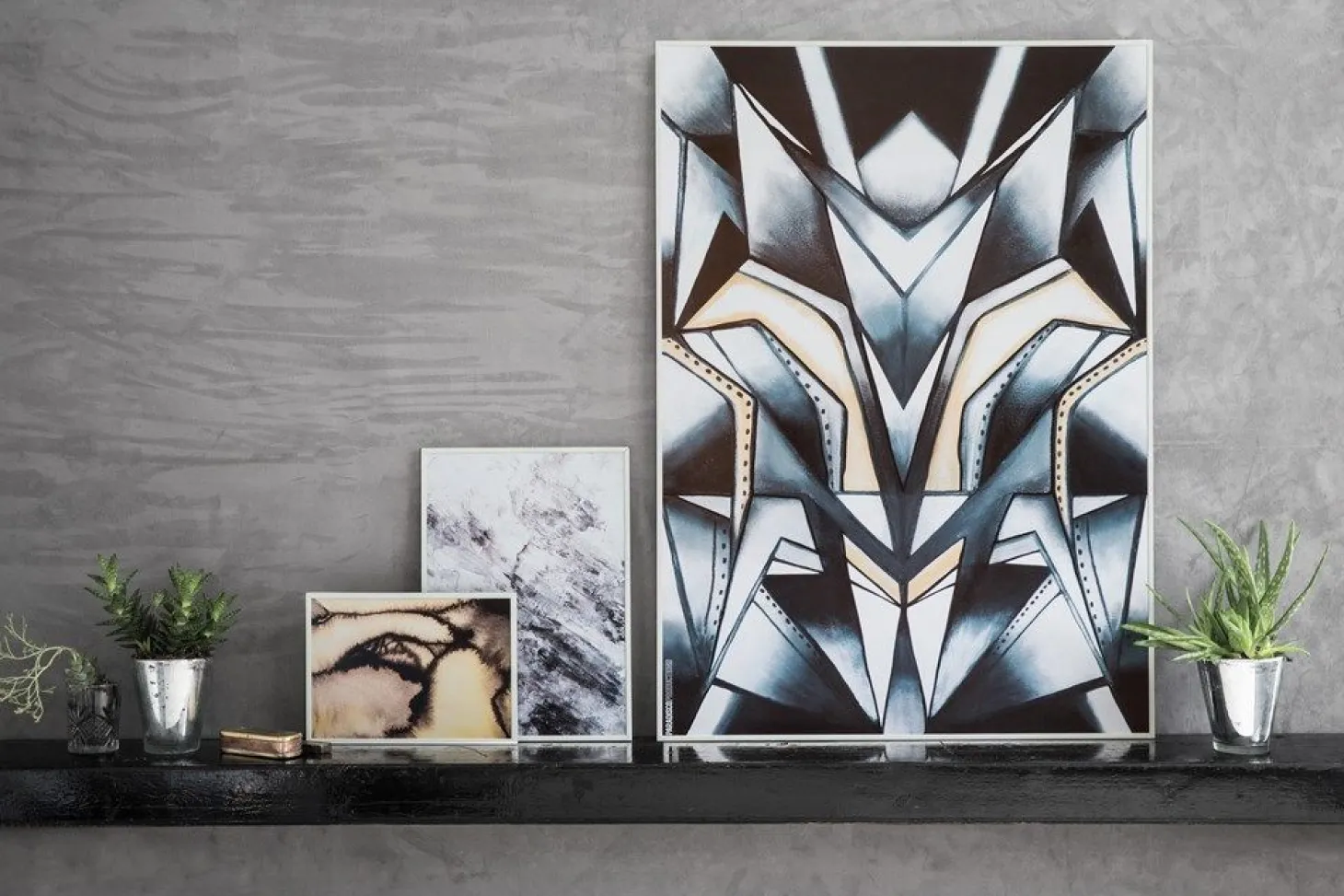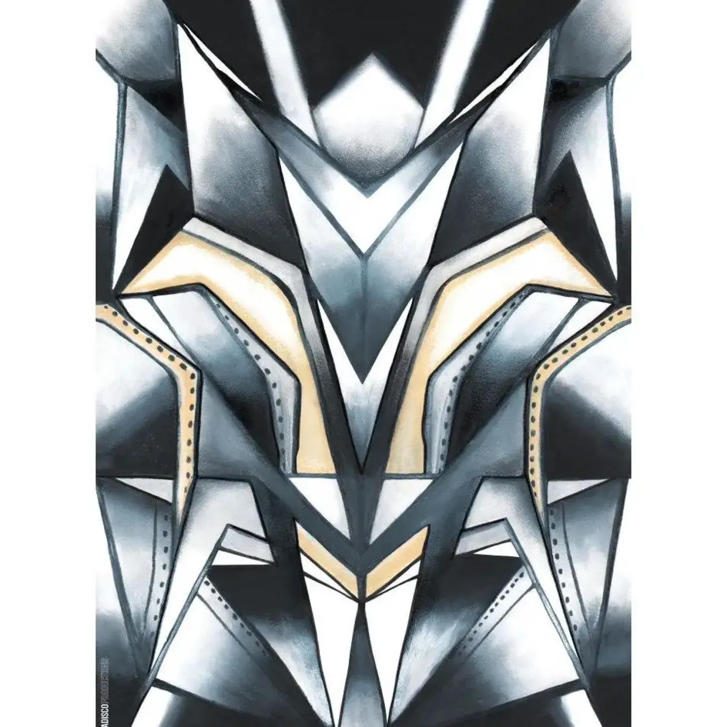 Lyst rammer mørkt, og spidse og blanke former skaber en rå og komplet balance i illustrationen. Det metalliske look er dannet af dip-dye og skyggeeffekter, og de rå industrielle detaljer mødes i en højere enhed i motivet.
