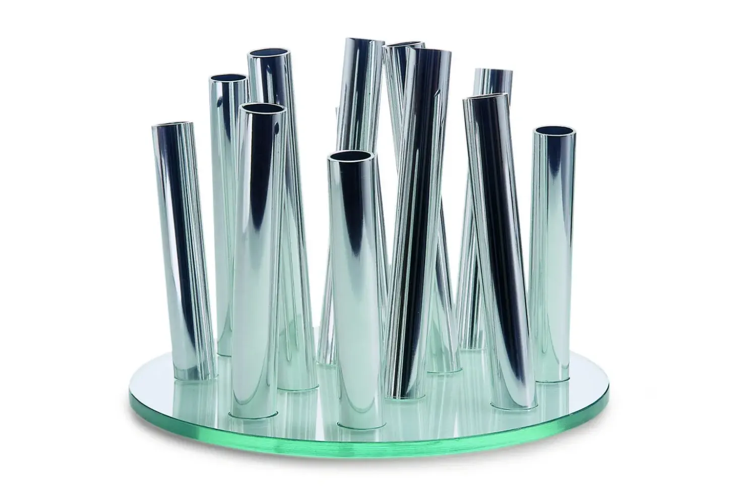 Bouquet-vasen kombinerer glas og poleret aluminium i en harmonisk komposition. De vertikale, rørformede elementer i varierende højder skaber et interessant visuelt udtryk, mens den polerede overflade bidrager til vasens elegante fremtoning.