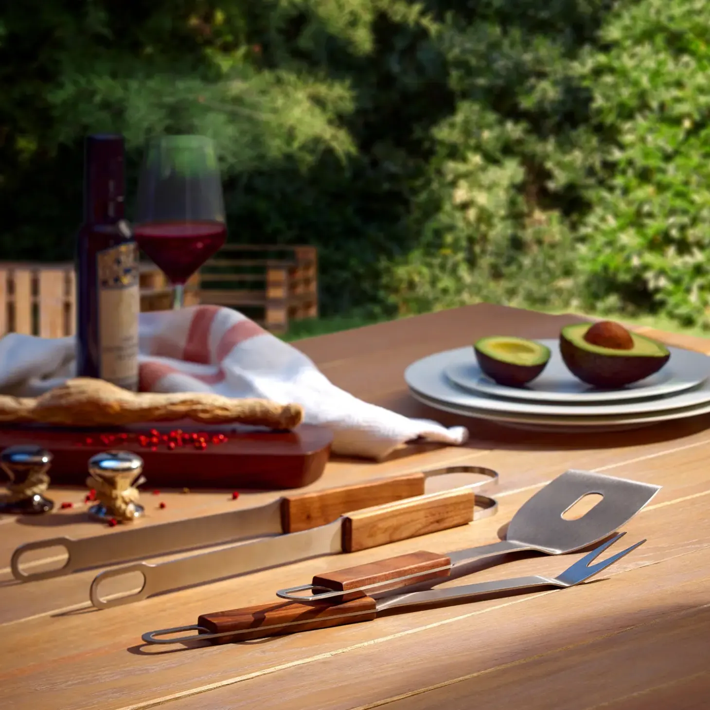 Valnøddetræ er berømt for sin holdbarhed og smukke, mørke farve. Det giver en naturlig og varm følelse, som gør grillbestikket behageligt at holde og bruge. Træets styrke sikrer, at håndtagene forbliver intakte og ser flotte ud over lang tid.