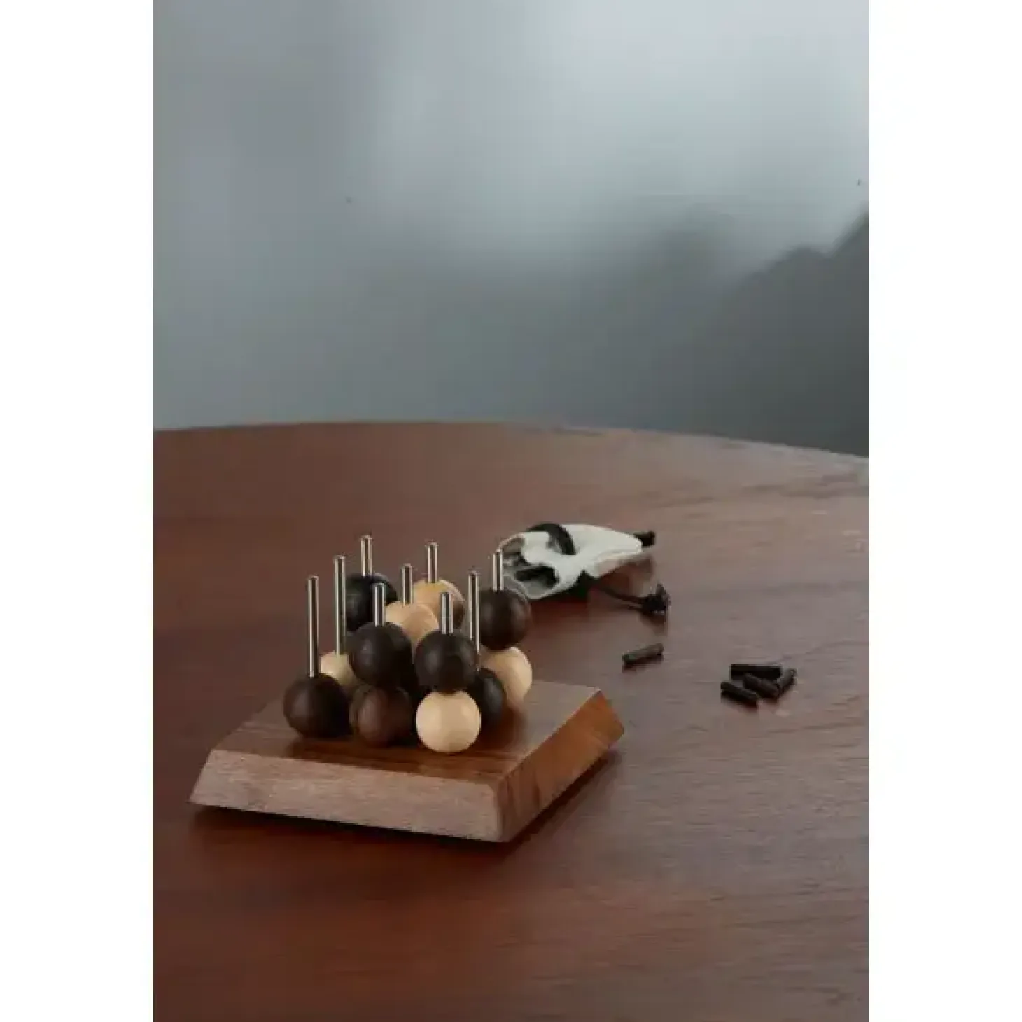 Spilleregler. Et strategisk spil for 2 deltagere, som skiftevis skal anbringe deres kugler og forsøge at få 3 af egne farver i række, vandret, lodret eller diagonalt. Den spiller, der flest gange kan lave en sådan kombination, er vinder. Regnskab føres ved hjælp af de sorte pinde. Der trækkes lod mellem spillerne om, hvem der skal begynde spillet. Hver spiller starter med 13 kugler. Den røde kugle (kamæleonkuglen) afgives til modparten af den spiller, der besætter centerfeltet, d.v.s. den midterste plads på den midterste stang. Denne placering, har stor strategisk betydning,idet den giver flere kombinationsmuligheder end nogen anden placering. Modparten kompenseres med nu at disponere over 14 kugler. Kamæleonkuglen, som anbringes sidst af samtlige kugler, har den egenskab, at den udover at gælde som spillerens egen farve yderligere giver indehaveren ret til point, hvis den ved sin placering færdiggør en række, hvor modstanderen har placeret 2 af sine kugler. Materialer. Baseplate Afromosia / afrikansk teak (latin: Pericopsis elata) Pinde i baseplate Rustfrit stål, syrefast (AISI 316) Kugler Hvide: Vakuumtørret Ahorn, Mørke: Mose-Eg (fremstillet), Rød: Vakuumtørret Ahorn Point-pinde Mose-Eg (fremstillet)