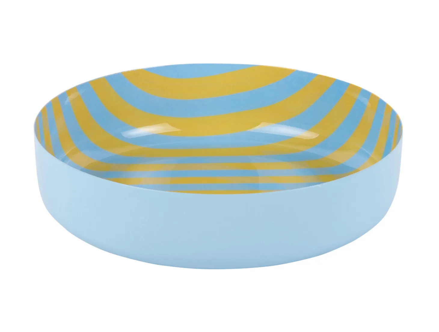 Hvis du søger noget mere end almindeligt hvidt service, giver denne skål dig en kunstnerisk dimension. Det bløde blå ydre skaber ro, mens det indvendige mønster med bølgende citrongule striber tilføjer dynamik. Den glatte finish sikrer, at skålen er praktisk i hverdagen.