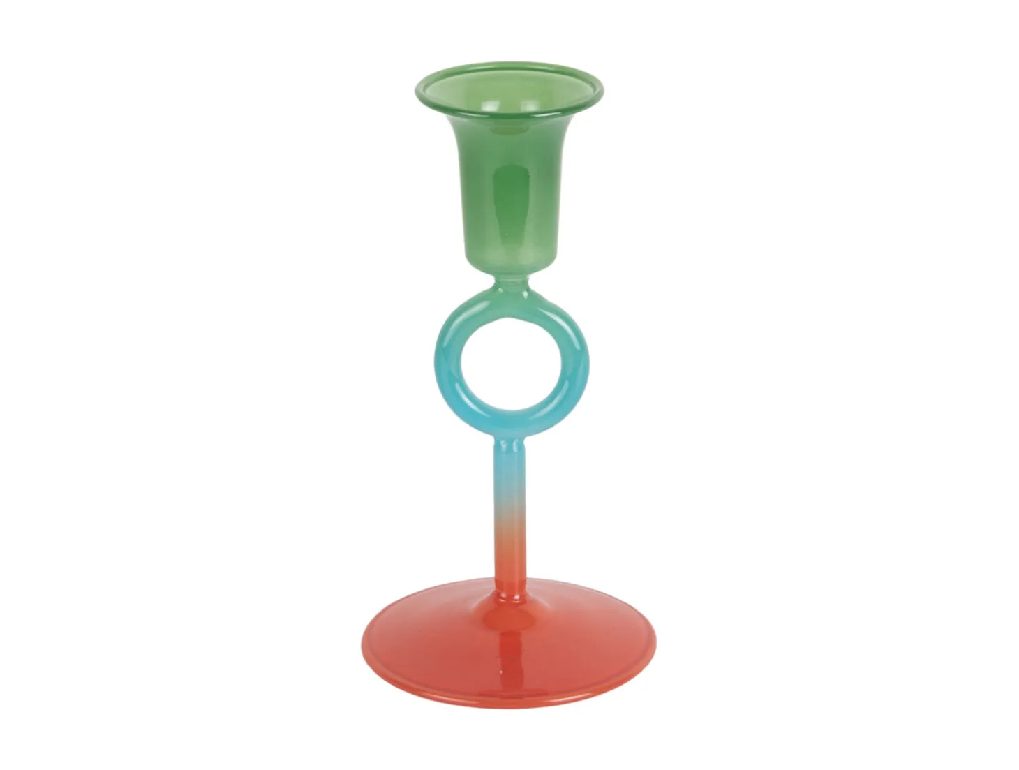 Lysestagen Anillo Vivo er fremstillet i glas, hvilket giver et holdbart materiale, der er let at rengøre. Det flerfarvede design kombinerer grøn, blå og rød i et karakteristisk udtryk, der tilføjer farve til din indretning. Med en højde på 15 cm er lysestagen synlig uden at dominere.