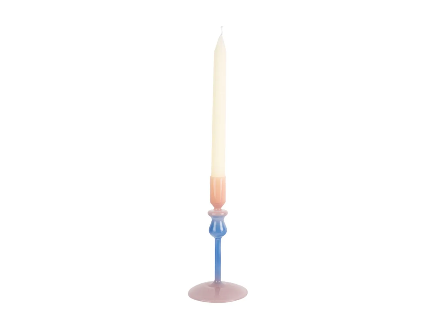Denne lysestage kombinerer blød pink med kobaltblå i et tofarvet design, der tilføjer farve til dit hjem. Fremstillet i glas giver den en klar overflade, der reflekterer lys naturligt. Med en højde på 18,5 cm er den synlig på borde og hylder.