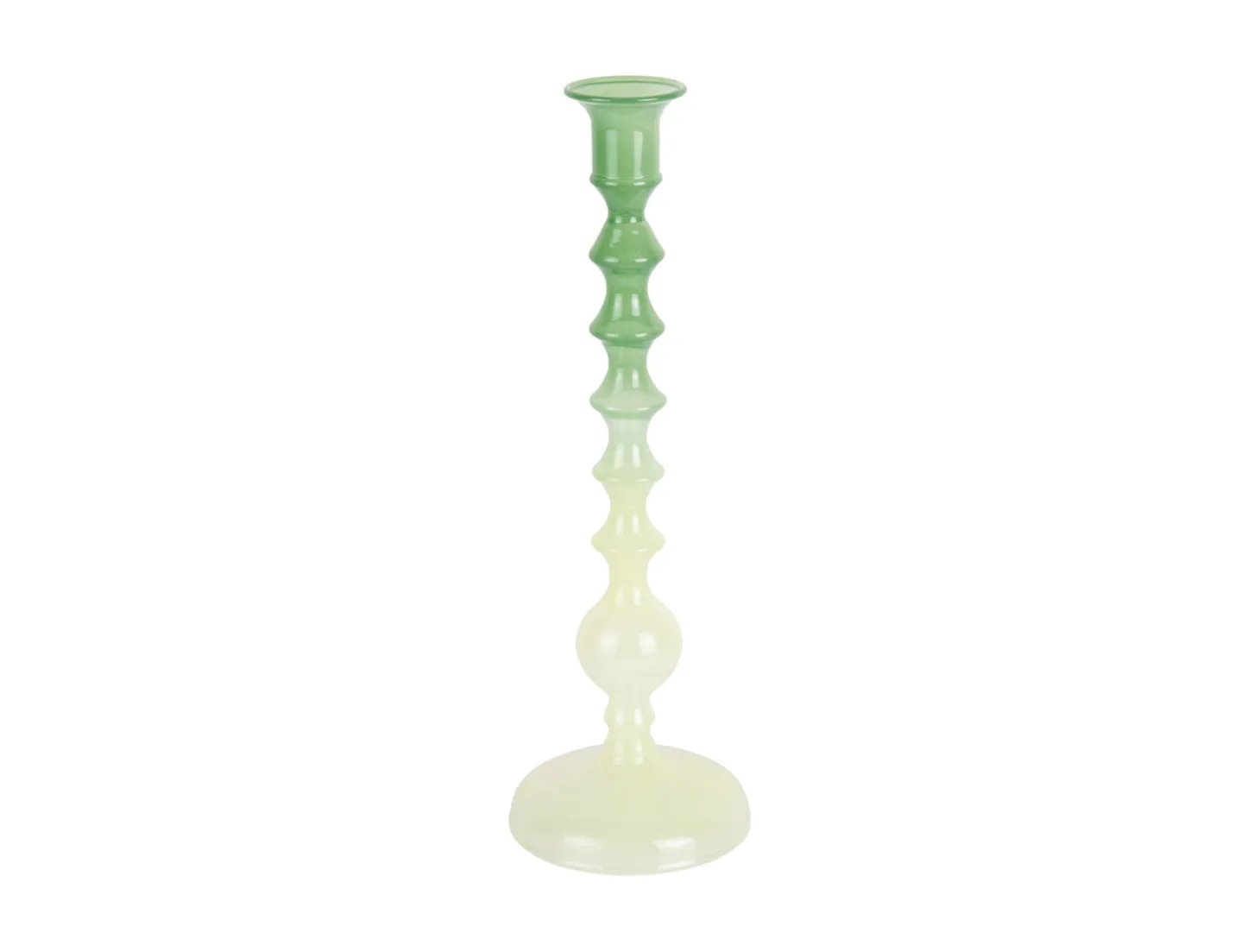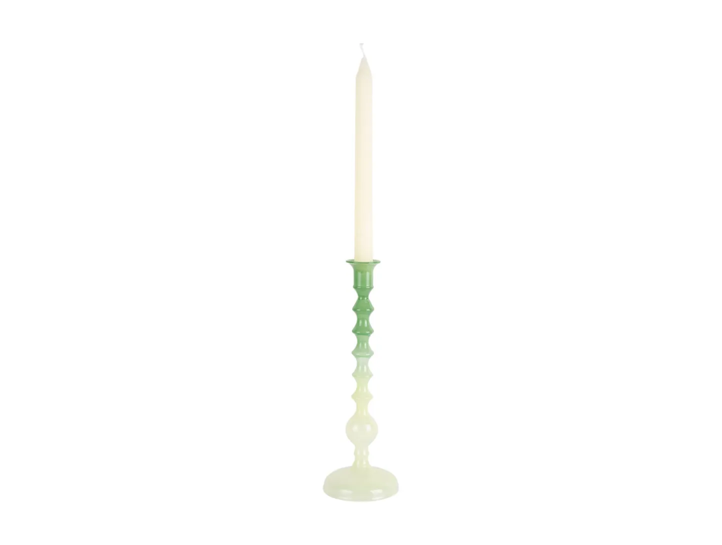 Denne lysestage fra Present Time har et skulpturelt design med en farveovergang fra retrogrøn til blød grøn. Glasmaterialet giver en transparent kvalitet, der fanger lyset smukt. Med en højde på 28 cm skaber den en vertikal dimension i dit rum.
