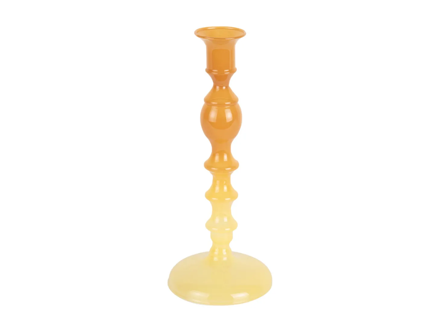 Denne lysestage fra Present Time har et gradientfarveskema, der glider fra okkergul til blød gul. Glasmaterialet fremhæver farveovergangen og giver en iøjnefaldende effekt i dit rum. Den ornamentale struktur med bulbøse former langs stangen skaber en kunstnerisk detalje.
