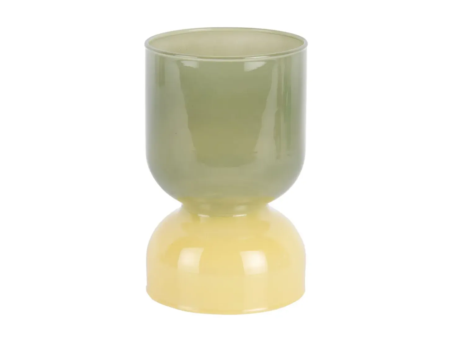 Denne lysestage kombinerer en junglegrøn top med en blød gul base i et tofarvet design. Materialet er glas, hvilket giver et stilrent udtryk og gør den nem at rengøre efter brug. Med en diameter på 9 cm og en højde på 13 cm passer den ind i forskellige rum uden at fylde for meget.