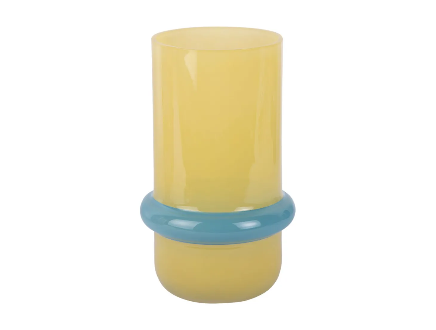 Denne vase fra Present Time bringer livlig farve ind i dit hjem. Den mango-gule glasoverflade, kombineret med en blød blå ring, skaber et moderne udtryk, der fanger blikket. Glasmaterialet giver en glat, blank finish, der er nem at rengøre og vedligeholde.