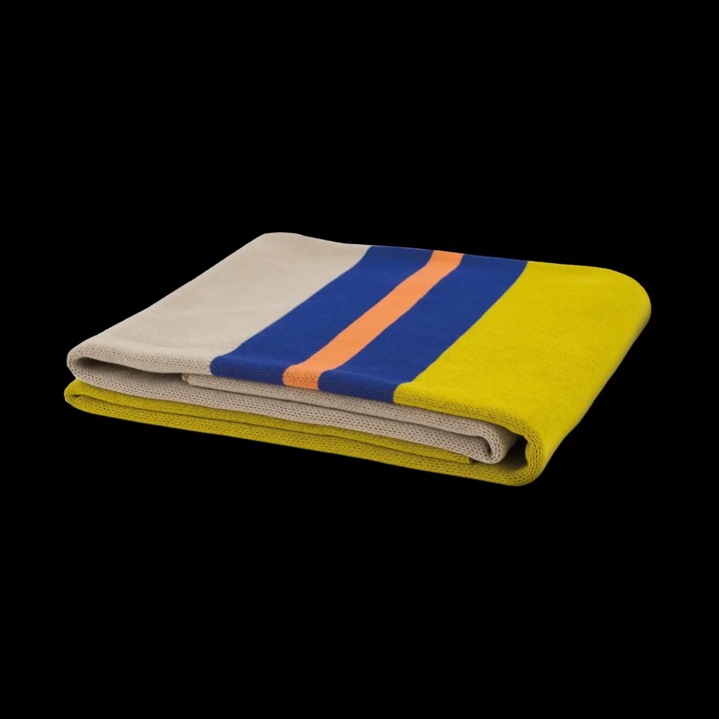 Dette tæppe er ikke bare smukt at se på; det er også utroligt praktisk. Brug det til en hyggelig aften i sofaen, som et ekstra lag varme på kølige nætter, eller tag det med ud på terrassen en lun sommeraften. Den strikkede bomuldsstruktur sikrer både blødhed og holdbarhed. De vandrette striber i forskellige farver, herunder blå og orange, giver tæppet et moderne og livligt udtryk, der nemt kan tilpasses forskellige indretningsstile.