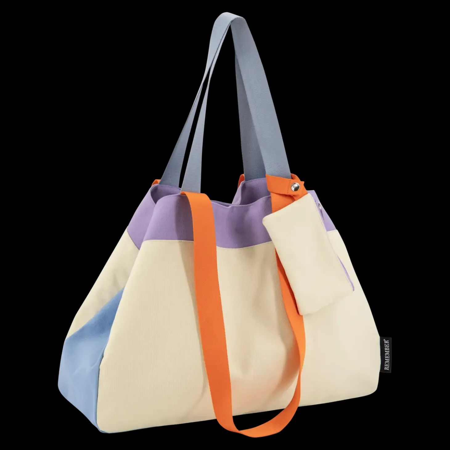 Denne lærredstaske er en praktisk ledsager til din aktive livsstil. Med sit farverige blokdesign i creme, blå, lilla og orange samt sit funktionelle design er den velegnet til alt fra shopping til strandture.