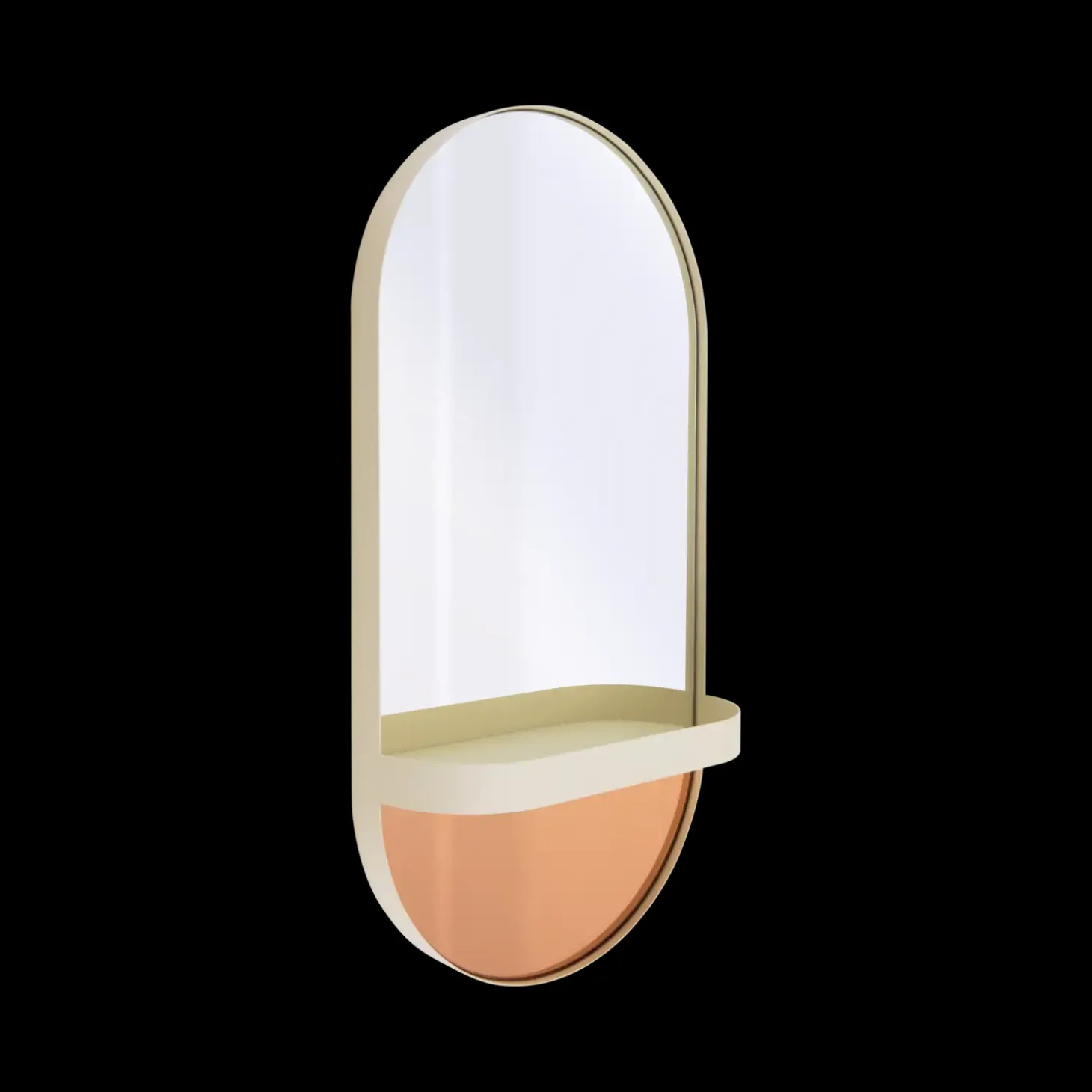 Den integrerede hylde skaber en visuel opdeling af spejlets overflade i to distinkte sektioner, mens hele overfladen forbliver fuldt funktionel som spejl. Hylden tilbyder praktisk plads til små, personlige genstande. Dette smarte design gør spejlet ideelt til både badeværelset, hvor det kan rumme toiletartikler, og entréen, hvor det kan holde styr på nøgler og småting. Det delvist farvede spejlglas tilføjer en unik dimension, der komplementerer en bred vifte af indretningsstile.