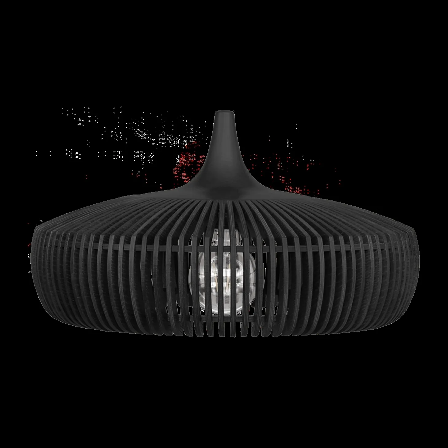 Smuk Umage Clava Dine Wood lampeskærm i et skulpturelt design, der giver et legende lysspil på rummets vægge. Lampen er designet med en håndværksteknik, der kræver stor præcision pga. den smalle afstand mellem lamellerne. Trælamellerne består af laserskåret ask- og egetræsfinér, mens toppen er i massiv egetræ.