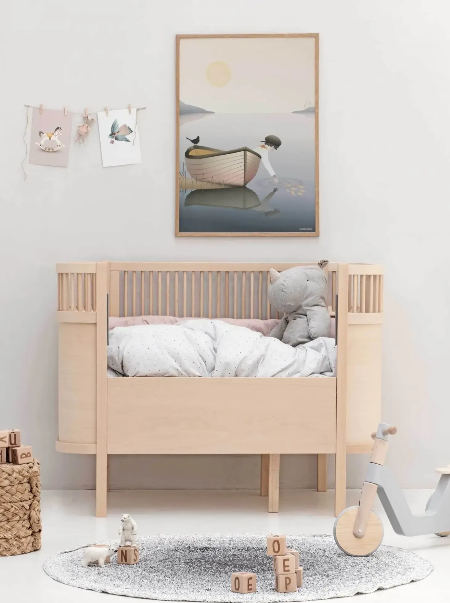 Fin plakat til børneværelset fra ViSSEVASSE. En stille aften ved skumringstid. Vandet er spejlblankt, og solens lys skaber dansende farver på vandoverfladen. Et magisk møde med fiskene, som strømmer hen til fingrene i vandskorpen. En stille stund helt alene, hvor bådens vippen luller dig ind i en afslappet tilstand til vands. Lige indtil mor råber, at aftensmaden er klar eller kasketten ryger i vandet med et stort plask, så fiskene skynder sig væk.