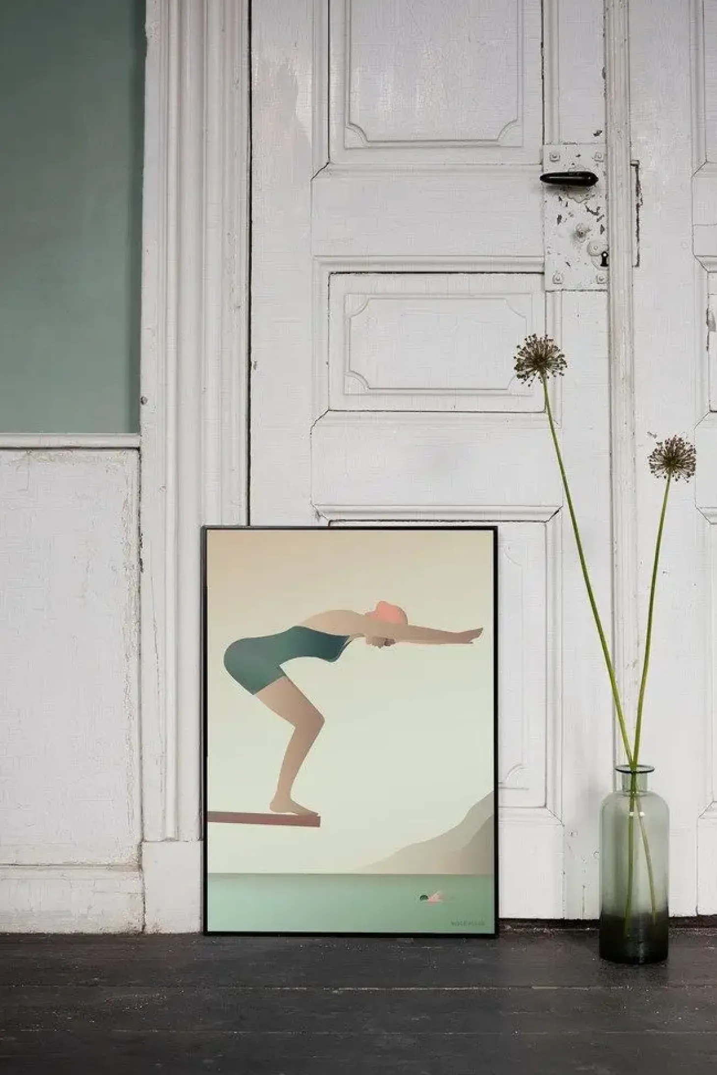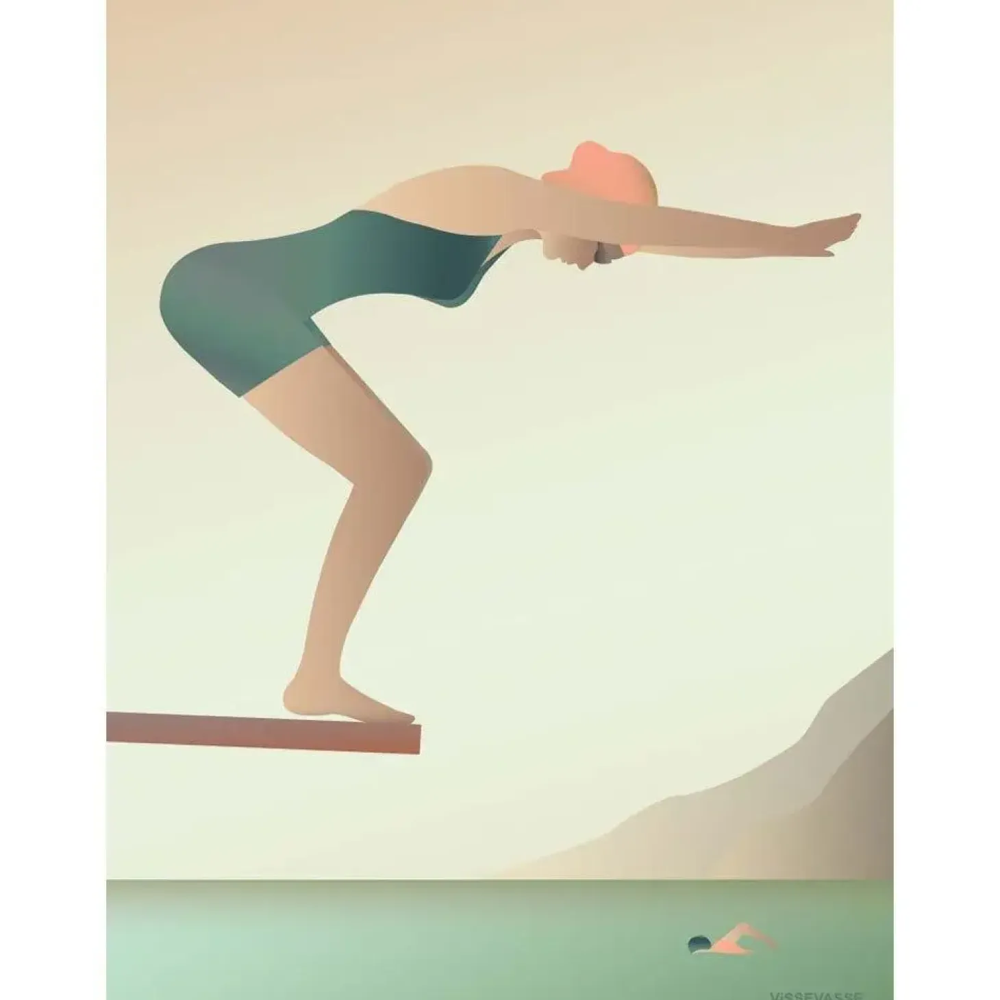 Det er ofte med en kildrende fornemmelse og sommerfugle i maven, at man står på vippen og kigger ned i det dybe vand. Man mærker vippens ru overflade under de våde tæer og tager lige en ekstra dyb indånding. Helt ned i maven. Også selvom man har stået her 20 gange før. Og så tager man springet – hvad enten det er til noget nyt i livet eller bare til en svømmetur. Så længe du kan svømme, skal du nok komme på fast grund igen. Tør du tage springet? Plakaterne er trykt på svensk miljøvenligt papir 170 gr. MultiArt Matt. Prisen er uden ramme. Størrelse: 15×21 cm